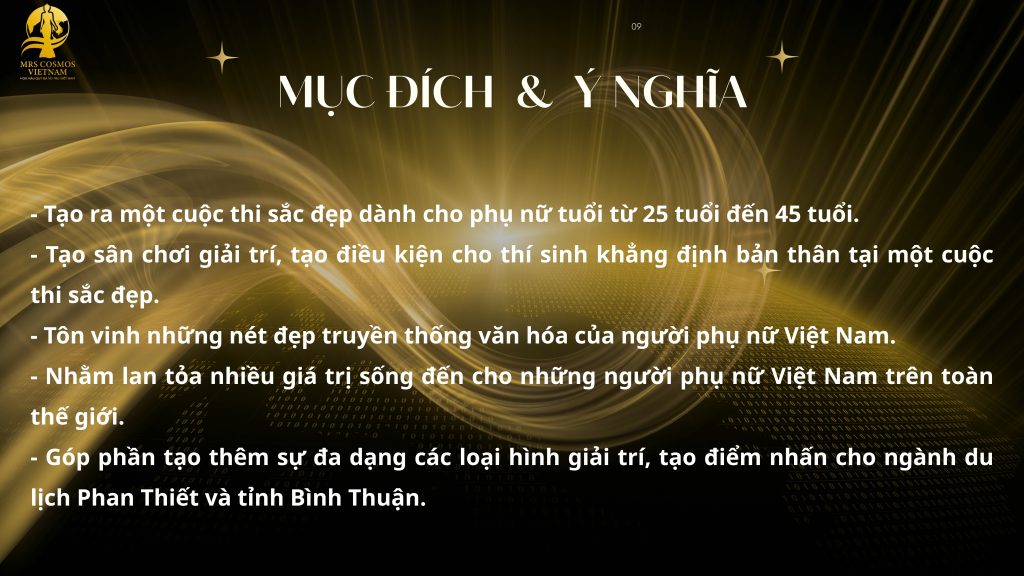 Cuộc thi hoa hậu Mrs Cosmos Vietnam 2025 không chỉ hướng đến sắc đẹp phụ nữ Việt Nam, mà còn mong muốn lan tỏa những thông điệp sống tích cực, truyền cảm hứng cho cộng đồng phụ nữ Việt trên toàn thế giới. Góp phần tạo thêm sự đa dạng các loại hình giải trí, tạo điểm nhấn cho ngành du lịch Phan Thiết và tỉnh Bình Thuận.